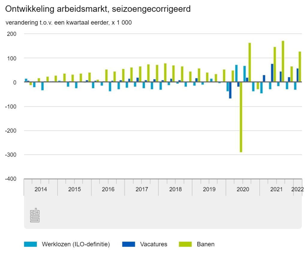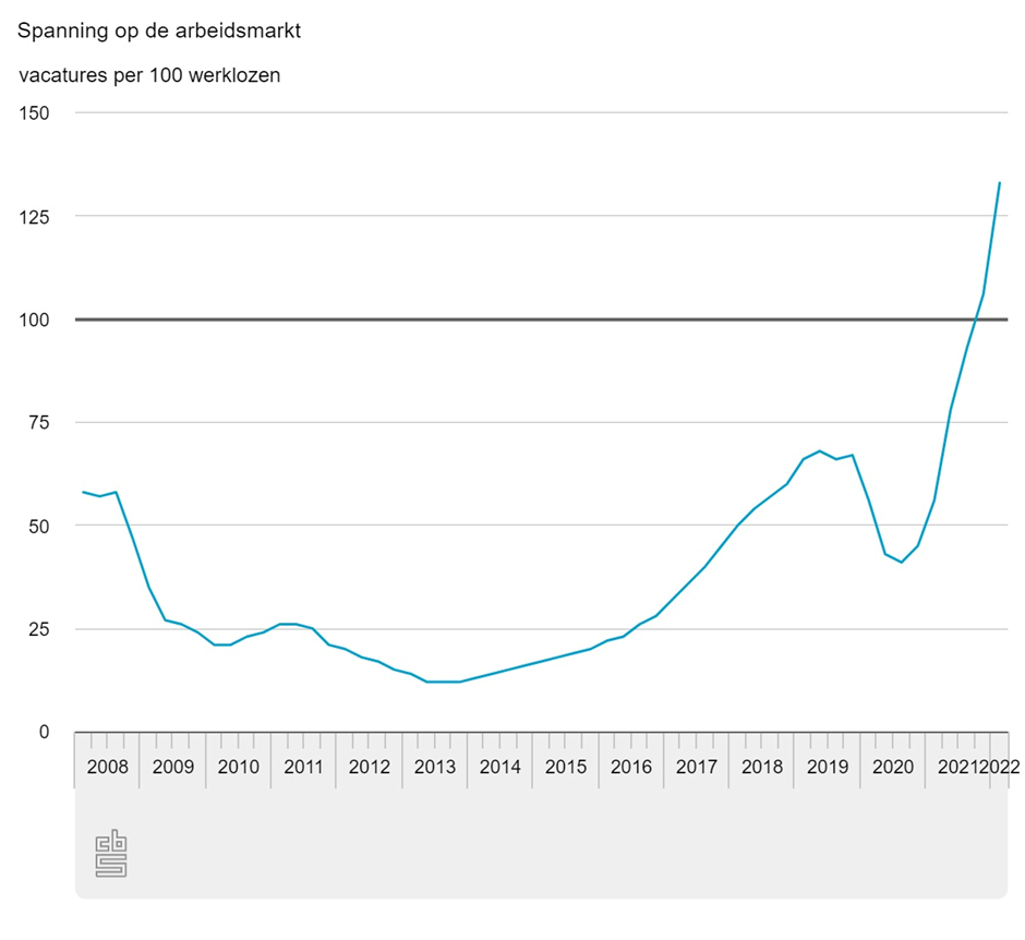 De spanning op de arbeidsmarkt is in het eerste kwartaal van 2022 verder toegenomen. Stonden er in het laatste kwartaal van 2022 nog 106 vacatures tegenover elke 100 werklozen, een kwartaal later is dat opgelopen tot 133 per 100. De toegenomen krapte is het resultaat van een aanhoudende groei van het aantal vacatures (met 59 duizend) en een verdere daling van het aantal werklozen (met 32 duizend). Het aantal banen nam toe met 127 duizend naar een recordhoogte van ruim 11 miljoen. Dat meldt het CBS op basis van nieuwe cijfers.